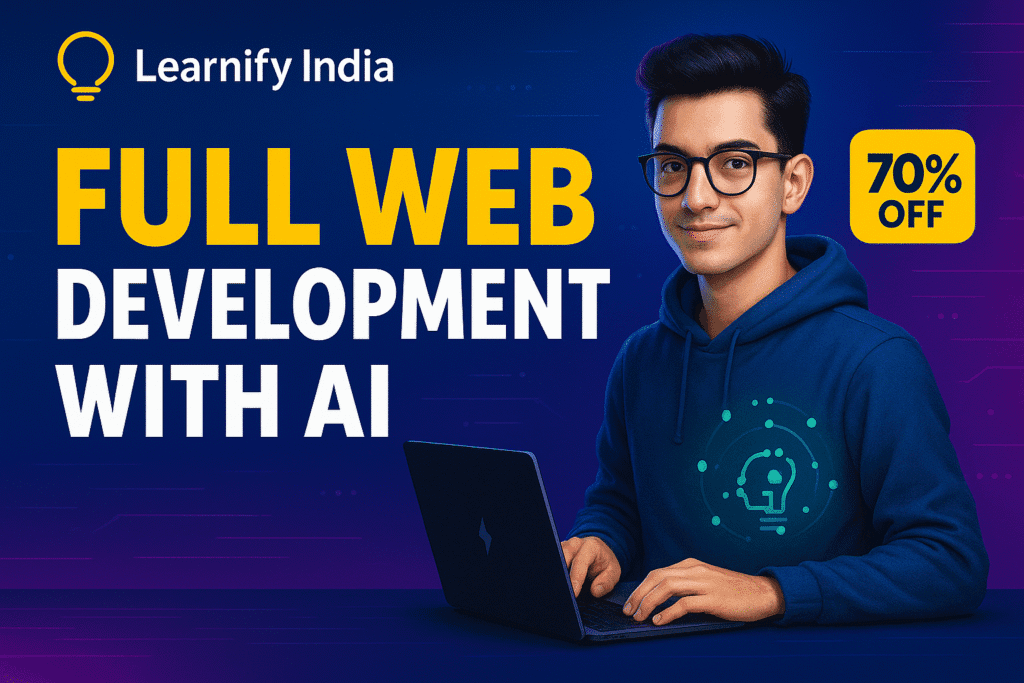 Namaste and Welcome to the future of creating websites! “AI-Powered Web Development” Learnify India ka ek revolutionary course hai jo aapko sikhayega ki kaise aap modern, professional, aur fully functional websites bana sakte hain – bina ek bhi line code likhe! Ji haan, aapne sahi suna. Hum sirf Artificial Intelligence (AI) tools aur platforms ka istemal karenge.